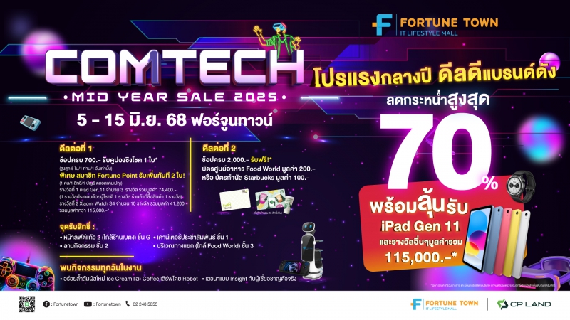 ฟอร์จูนทาวน์ระเบิดโปรกลางปี! ชวนช็อปงาน Comtech Mid Year Sale 5–15 มิ.ย. นี้ ลดกระหน่ำสูงสุด 70% ขนดีลไอทีสุดคุ้ม พร้อมลุ้น iPad และของรางวัลมูลค่ารวมกว่า 100,000 บาท