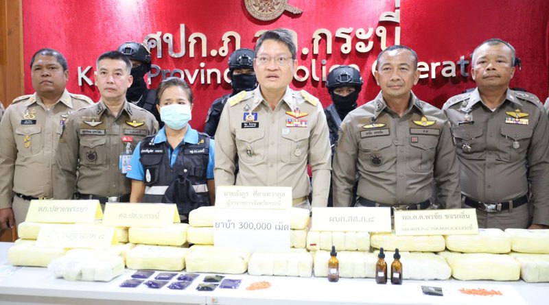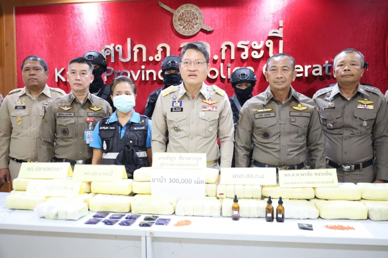 ผู้ว่าฯกระบี่นำแถลงจับกุมผู้ค้ายาเสพติดรายสำคัญ 3 คน พร้อมยาบ้า 300,000 เม็ด ตบตาเจ้าหน้าที่ลอบขนส่งทางรถทัวร์โดยสารประจำทางสายเชียงใหม่-ภูเก็ต