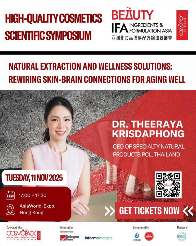 วงการบิวตี้เอเชียเตรียมคึกคักอีกครั้งในเดือนพฤศจิกายนนี้ เมื่อมีข่าวดีว่า ดร.ธีรญา กฤษฎาพงษ์ CEO หญิงคนเก่งแห่ง บมจ.สเปเชี่ยลตี้ เนเชอรัล โปรดักส์ จะขึ้นเวทีใหญ่ระดับนานาชาติในงาน BEAUTY IFA (Ingredients & Formulation Asia) ที่จะจัดขึ้น ณ AsiaWorld-Expo ประเทศฮ่องกง