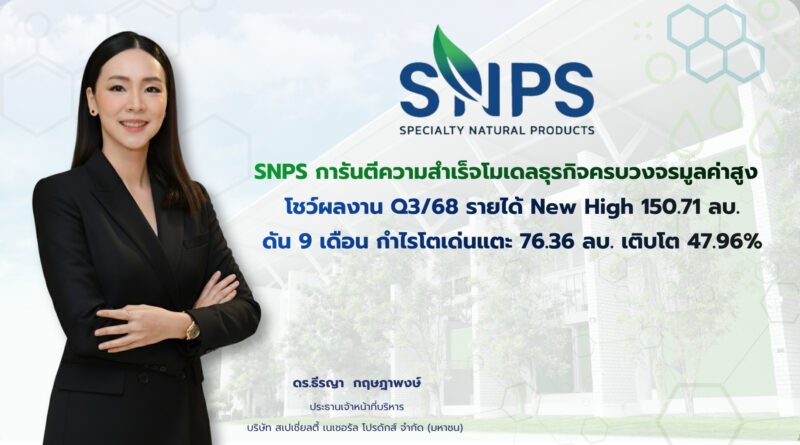 SNPS การันตีความสำเร็จโมเดลธุรกิจครบวงจรมูลค่าสูง โชว์ผลงานQ3/68 รายได้ New High 150.71 ลบ. ดัน 9 เดือน กำไรโตเด่นแตะ 76.36 ล้านบาท เติบโต 47.96%