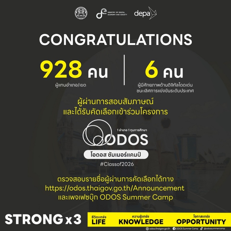 “ดีป้า ขอแสดงความยินดีกับเยาวชนไทยทุกคนที่ผ่านการคัดเลือกในรอบสุดท้าย ทั้งนี้ ในกิจกรรม ODOS Summer Camp Selection Day #Classof2026 มีเยาวชนที่มีสิทธิ์จับสลากเลือกหลักสูตร/ประเทศ และสอบสัมภาษณ์ฯ ทั้งสิ้น 928 คน โดยในจำนวนนี้มีผู้สละสิทธิ์ไม่มาเข้าร่วมกิจกรรม จำนวน 7 คน สำหรับการสอบสัมภาษณ์มีผู้แทนหลักสูตร และผู้แทนจากสถานทูตเป็นกรรมการสอบสัมภาษณ์ โดยมีเยาวชนที่ผ่านการสอบสัมภาษณ์ จำนวน 888 คน ไม่ผ่านการสอบสัมภาษณ์ จำนวน 33 คน เนื่องจากไม่เป็นไปตามเกณฑ์เรื่องทักษะการสื่อสารด้วยภาษาอังกฤษ และเกณฑ์อื่น ๆ ตามที่คณะกรรมการกำหนด ทั้งนี้ คณะกรรมการได้คัดเลือกผู้สมัครรายชื่อสำรอง ซึ่งเป็นผู้ที่มีคะแนนในลำดับถัดไปของอำเภอ/เขต หรือจังหวัด เพื่อเข้าสู่กระบวนการคัดเลือก และจับสลากแทนผู้ที่สละสิทธิ์/สอบไม่ผ่าน จำนวน 40 คน และได้ผู้แทนอำเภอ/เขตครบถ้วน 928 คนแล้ว” ผู้อำนวยการใหญ่ ดีป้า กล่าว