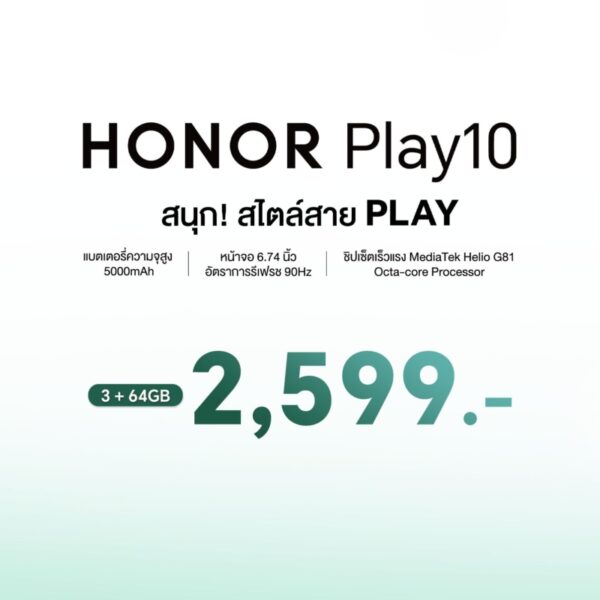 HONOR Play10 ราคา 2,599 บาท มี 2 สี ได้แก่ สี Midnight Black และ สี Ocean Cyan วางจำหน่ายตั้งแต่วันที่ 23 มกราคม 2569 ที่ HONOR Experience Store ทุกสาขา และร้านค้าตัวแทนจำหน่ายทั่วประเทศ สามารถติดตามรายละเอียดได้ที่ https://url.in.th/CXgWq