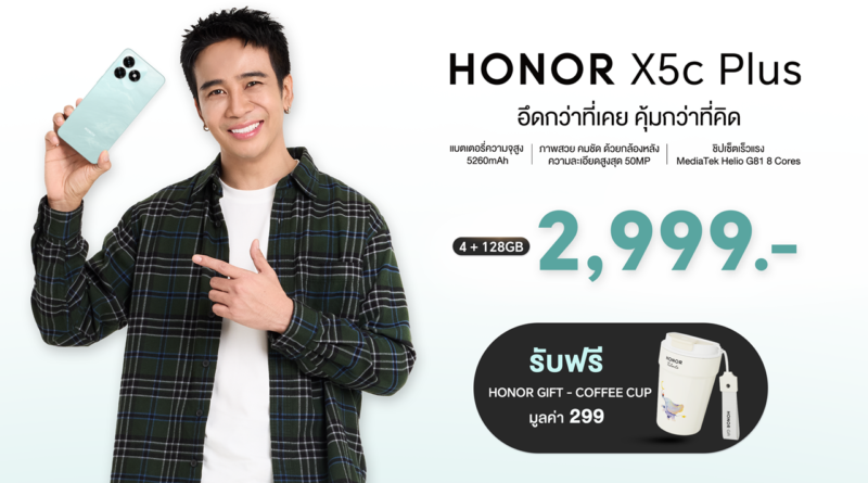 HONOR X5c Plus ราคา 2,999 บาท มี 2 สี ได้แก่ สี Meteor Silver และ สี Ocean Cyan รับโปรโมชันพิเศษเมื่อซื้อ HONOR X5c Plus รับฟรี HONOR Gift – Coffee Cup มูลค่า 299 บาท ตั้งแต่วันที่ 23 มกราคม 2569 ถึงวันที่ 28 กุมภาพันธ์ 2569 หรือจนกว่าของแถมจะหมด จำหน่ายที่ HONOR Experience Store ทุกสาขา และร้านค้าตัวแทนจำหน่ายทั่วประเทศ หรือ https://url.in.th/yKDRs