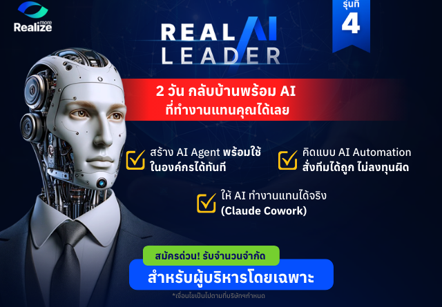 เตรียมตัวให้พร้อมสำหรับการเป็น “ผู้นำตัวจริง” ในยุค AI ที่ตัดสินใจได้อย่างเฉียบคมและมีทิศทาง ในหลักสูตร Real AI Leader รุ่น 4 ในวันที่ 19 และ 26 มีนาคมนี้ ที่ โรงแรม Valia Hotel Bangkok สุขุมวิท 24